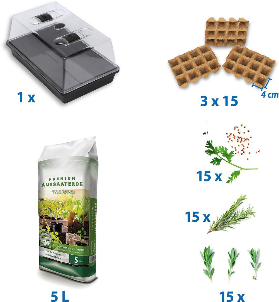 • 5 Liter Aussaaterde (torffrei) sowie Samen zur Anzucht von Petersilie, Rosmarin und Thymian (je 15 Stück.)