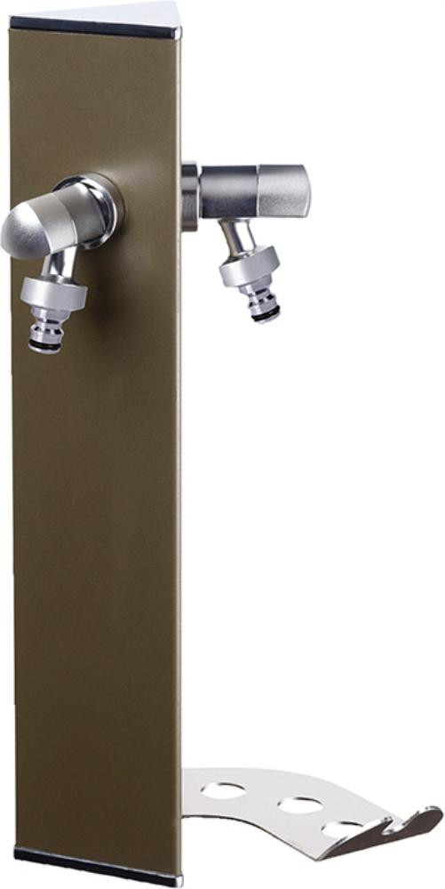 • Die Zapfstelle verfügt über einen 1/2" AG Wasseranschluss auf der Rückseite und zwei Entnahmestellen 3/4" in passendem Design mit Außengewinde und verchromten Hahnstücken