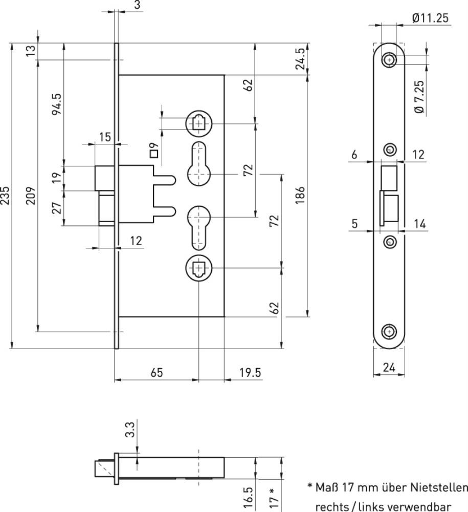 Funktion von der Gefahrenseite (innen) : Über den Drücker werden der Riegel und die Falle zurückgezogen. Durchgang ist immer möglich. Funktion von der Bandseite (außen) : Durch Verwendung einer Wechselgarnitur mit feststehendem Knauf ist eine Öffnung der Tür nur mit dem Schl üssel möglich.