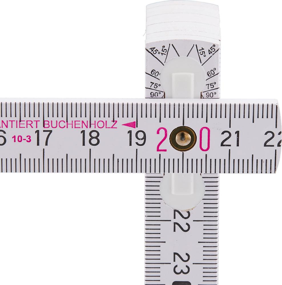 • Durch die eingelassenen Gelenke entsteht im ausgeklappten Zustand eine durchgehend gerade Kante, der Maßstab ist so auch als Lineal für eine durchgezogene Anreißlinie zu verwenden