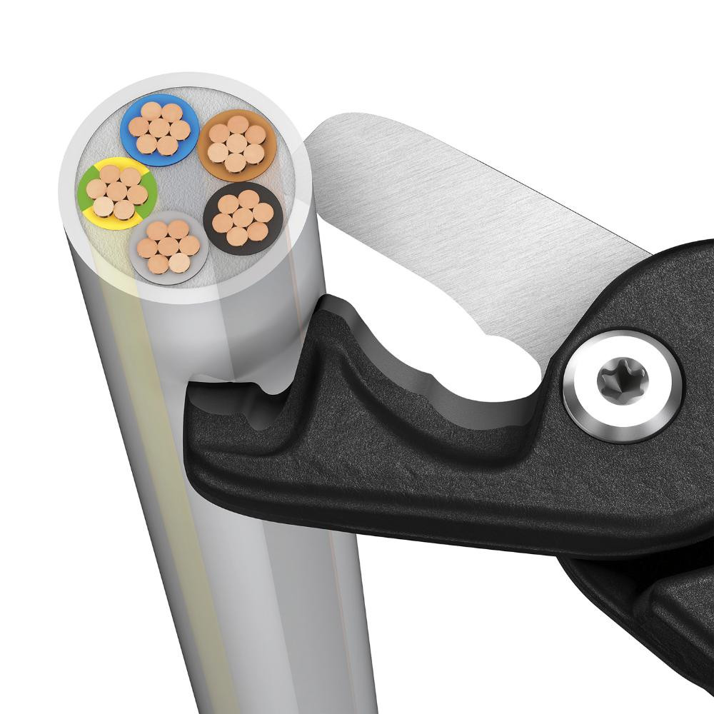 • Mit einer Hauptschneide für gelenknahe Schnitte und einer Frontschneide für das schrittweise Durchtrennen von sehr großen Kabeln, wobei Abstufungen die Adern in günstiger Position halten