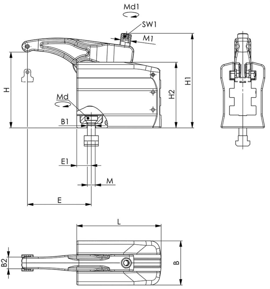 • Einsatz in T-Nuten 14 bis 28 mm bzw. Rasterplatten M12, M16, M20, 2 Druckstückvarianten