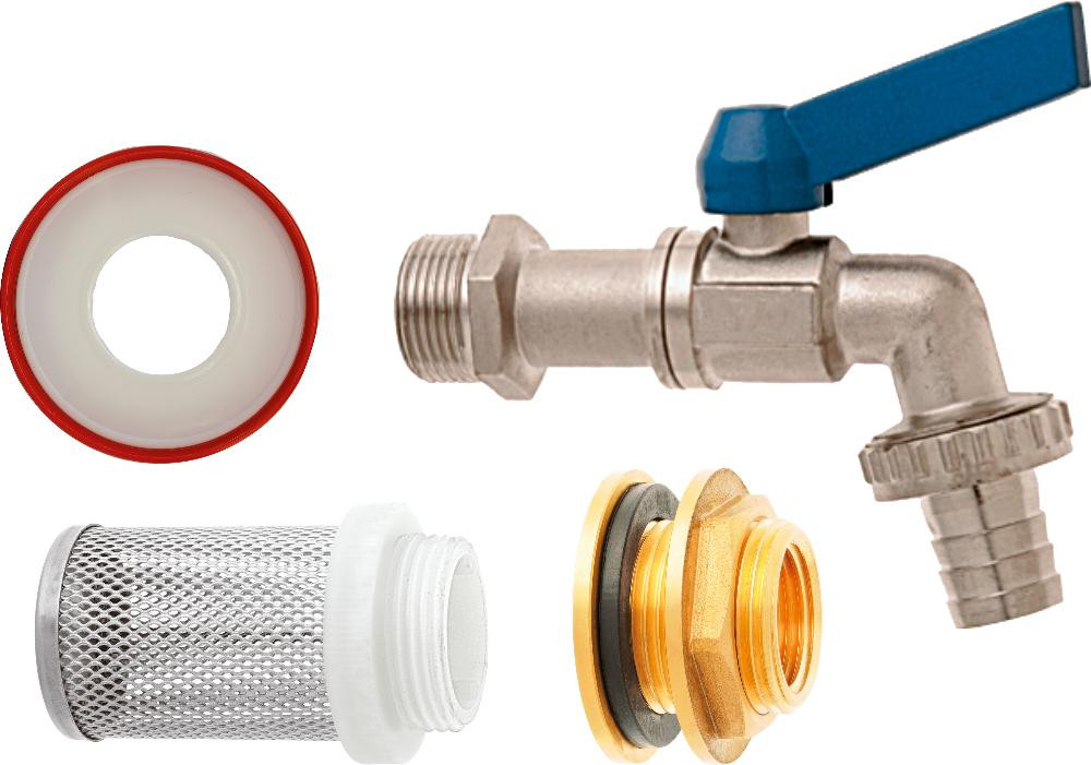 Lieferumfang: Kugelauslaufventil, Regentonnen-Anschluss, Saugkorb, Gewindeband.