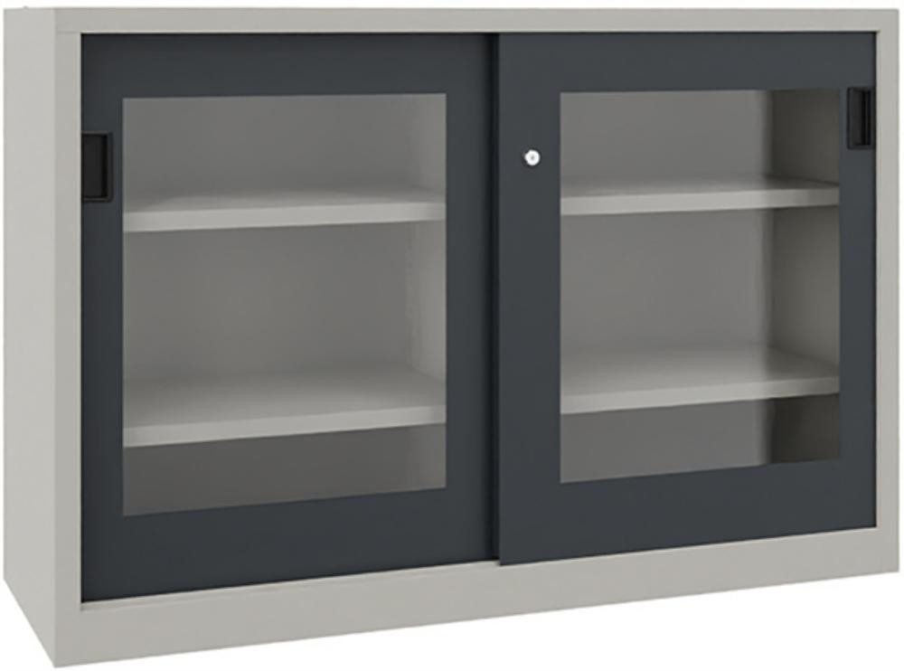 Schwerlastschiebetürenschrank, mit Sichtfenstertüren und Mitteltrennwand, Böden gepulvert