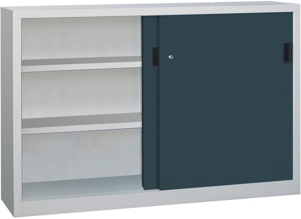 Schwerlastschrank H1000xB1500xT400 mm 4 Böden verz. Mittelwand RAL 7035 Schiebetür K23553488