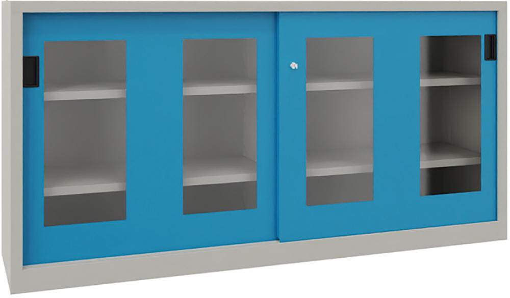 Schwerlastschiebetürenschrank, mit Sichtfenstertüren und Mitteltrennwand, Böden gepulvert