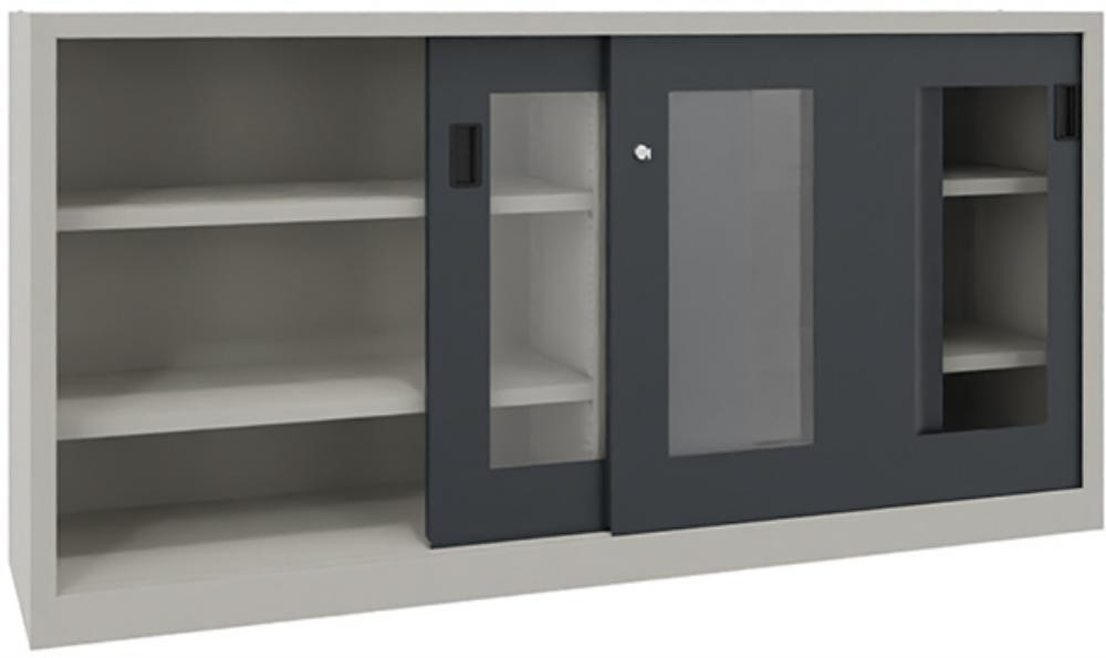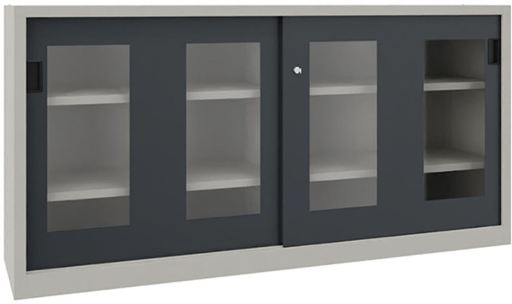 Schwerlastschiebetürenschrank, mit Sichtfenstertüren und Mitteltrennwand, Böden gepulvert