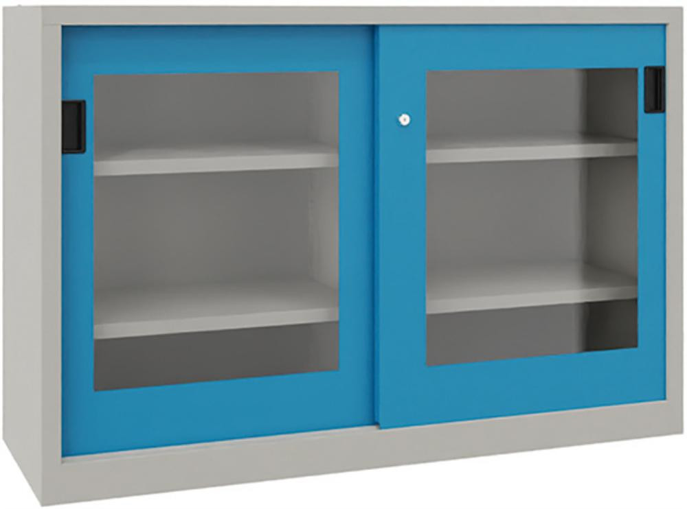 Schwerlastschiebetürenschrank, mit Sichtfenstertüren und Mitteltrennwand, Böden gepulvert