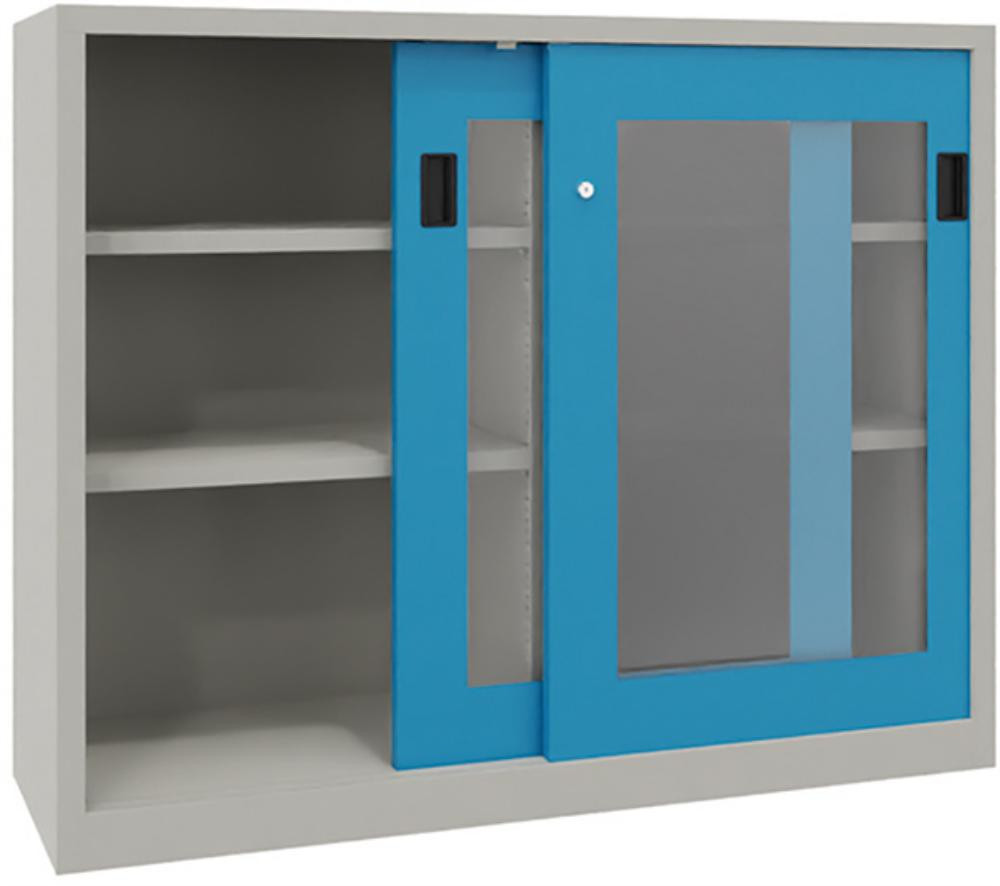 Schwerlastschiebetürenschrank, mit Sichtfenstertüren und Mitteltrennwand, Böden gepulvert