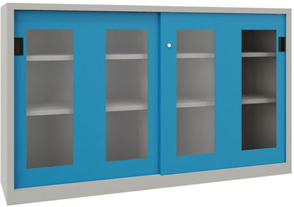 Schwerlastschiebetürenschrank, mit Sichtfenstertüren und Mitteltrennwand, Böden gepulvert
