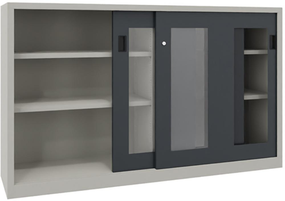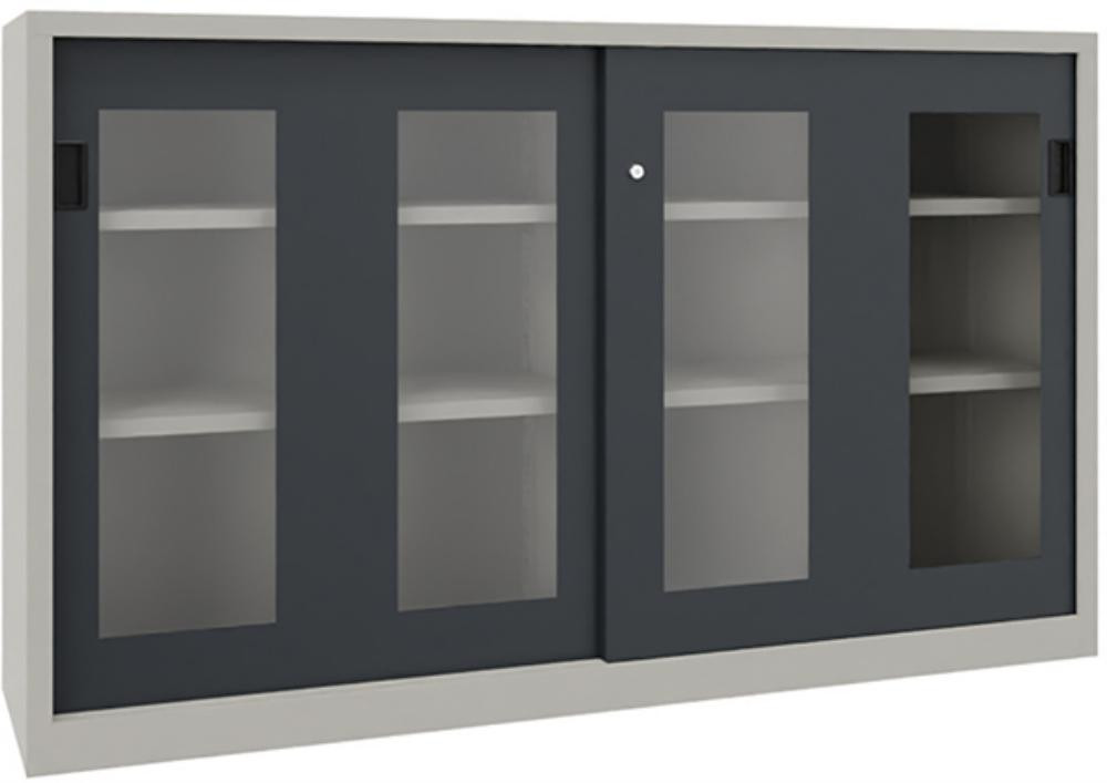 Schwerlastschiebetürenschrank, mit Sichtfenstertüren und Mitteltrennwand, Böden gepulvert