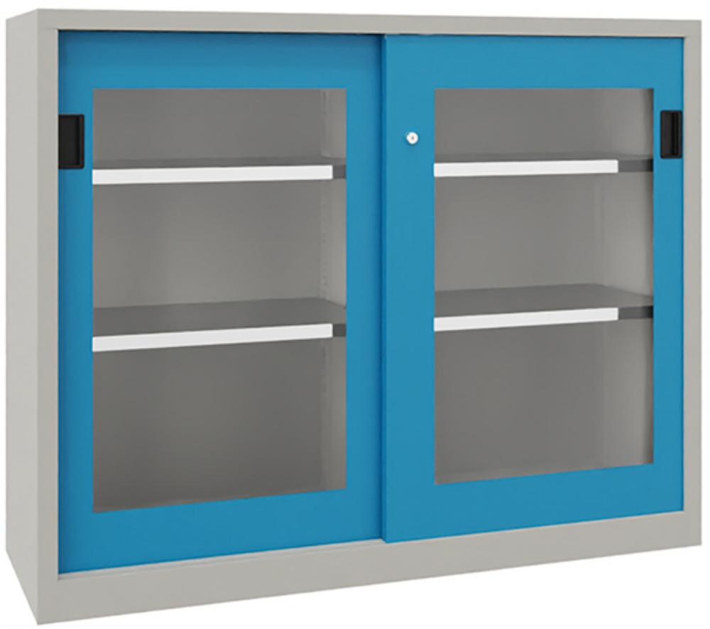 Schwerlastschiebetürenschrank, mit Sichtfenstertüren und Mitteltrennwand, Böden verzinkt