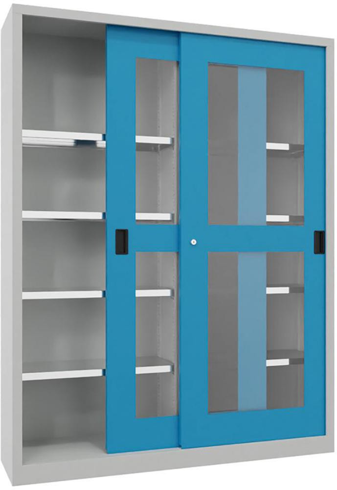 Schwerlastschiebetürenschrank, mit Sichtfenstertüren und Mitteltrennwand, Böden verzinkt