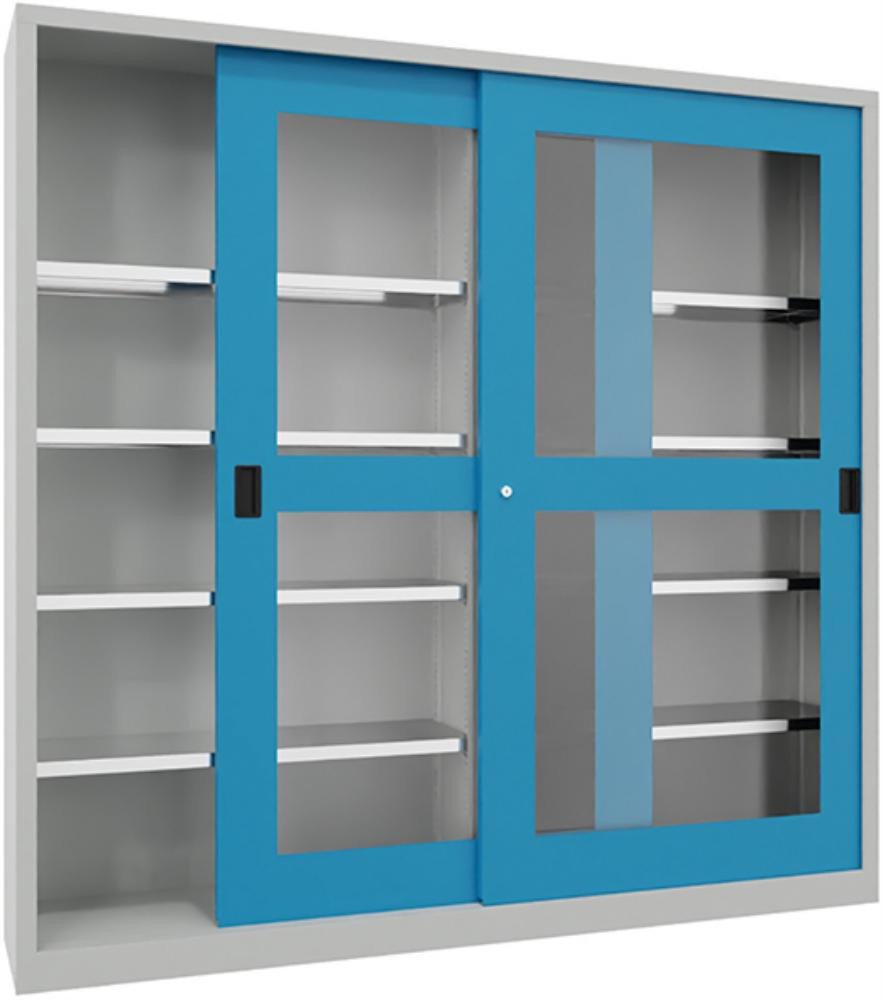 Schwerlastschiebetürenschrank, mit Sichtfenstertüren und Mitteltrennwand, Böden verzinkt