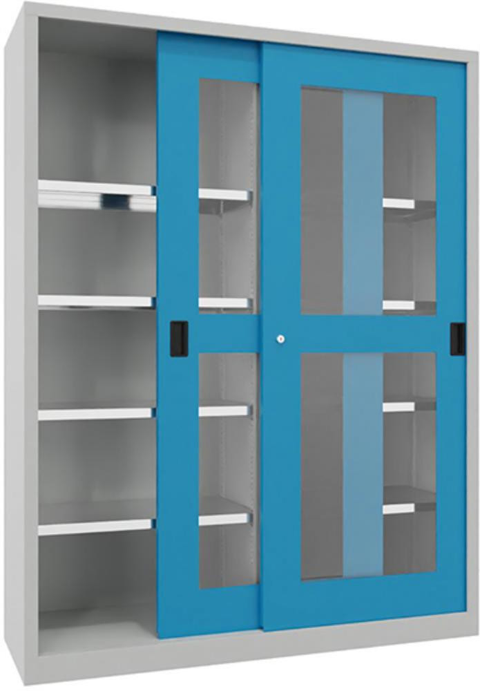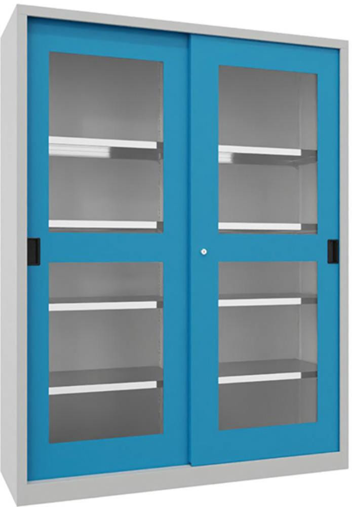 Schwerlastschiebetürenschrank, mit Sichtfenstertüren und Mitteltrennwand, Böden verzinkt