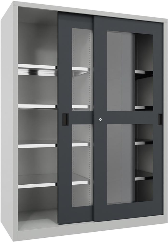 Schwerlastschiebetürenschrank, mit Sichtfenstertüren und Mitteltrennwand, Böden verzinkt