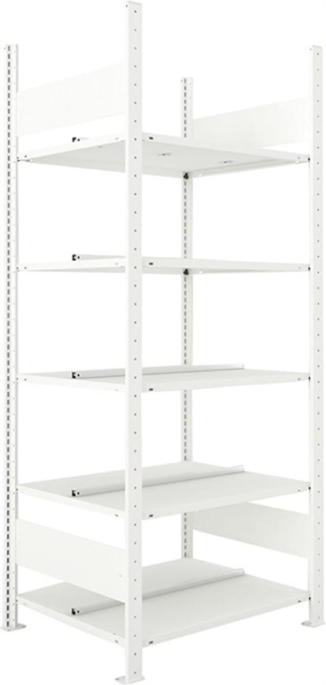 Anbauregal: 1 Rahmen, Fachböden (gemäß Tabelle) und Montagezubehör.
