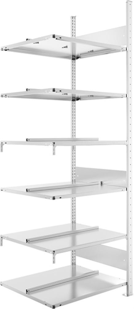 Anbauregal: 1 Rahmen, Fachböden (gemäß Tabelle) und Montagezubehör.
