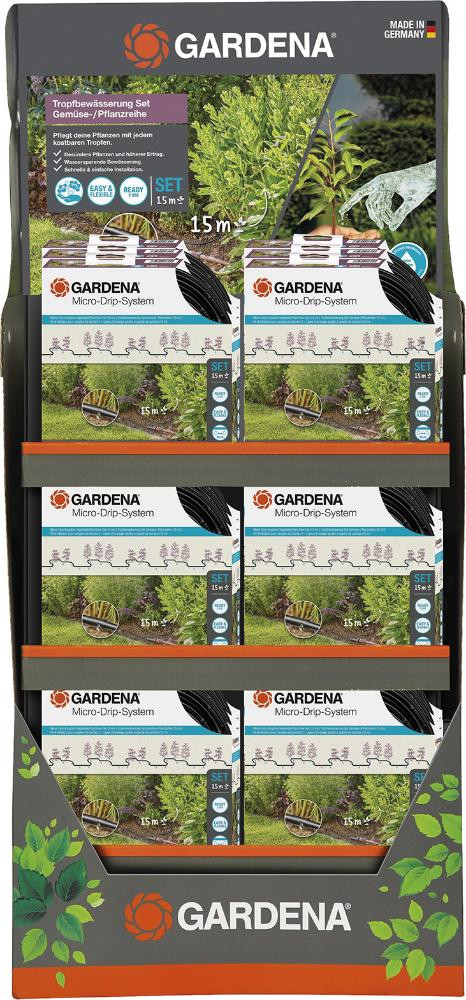 GARDENA Display bestehend aus 38 Stück 13010-20Micro-Drip-System Tropfbewässerung Set Gemüse-/Pflanzreihe (15 m).
