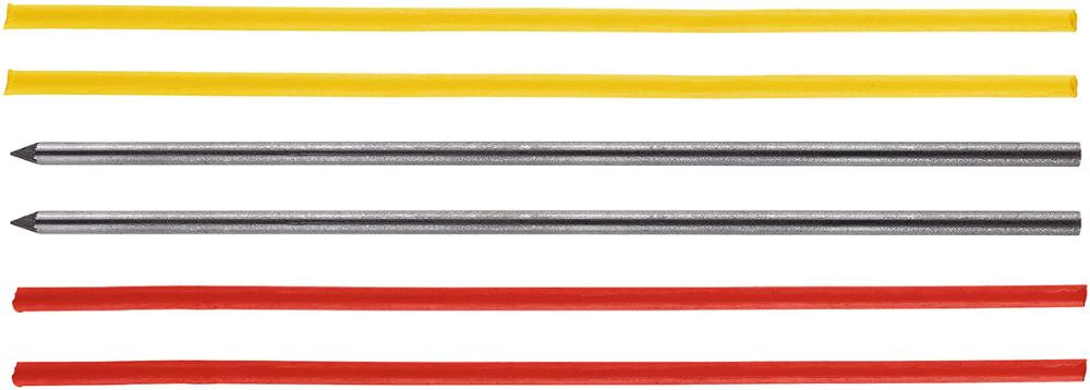 • Gelbe und rote Minen auf Wachsbasis, sind ideal für sehr glatte und dunkle Oberflächen, wasserfest außer auf Glas